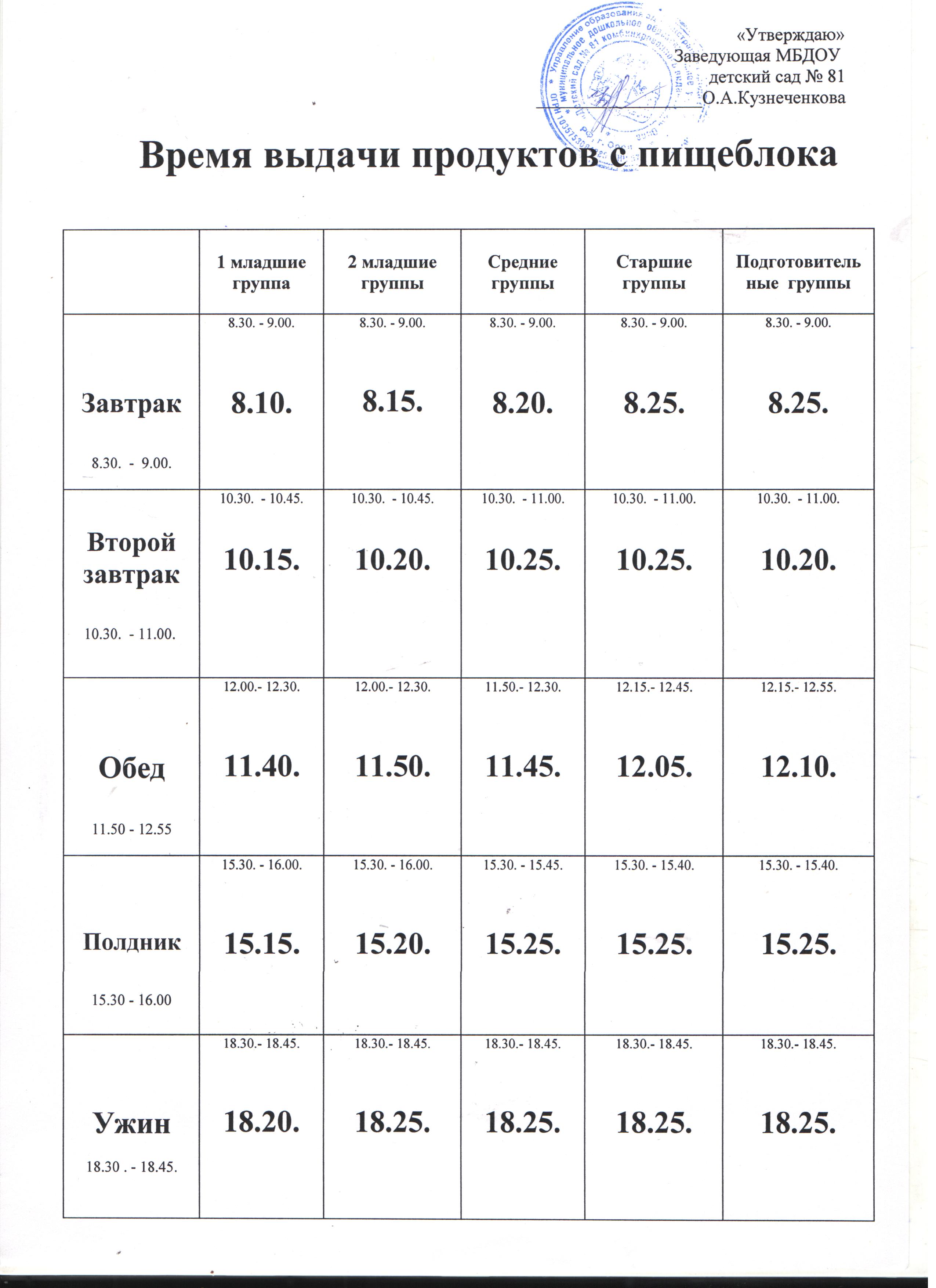 График выдачи пищи с пищеблока
