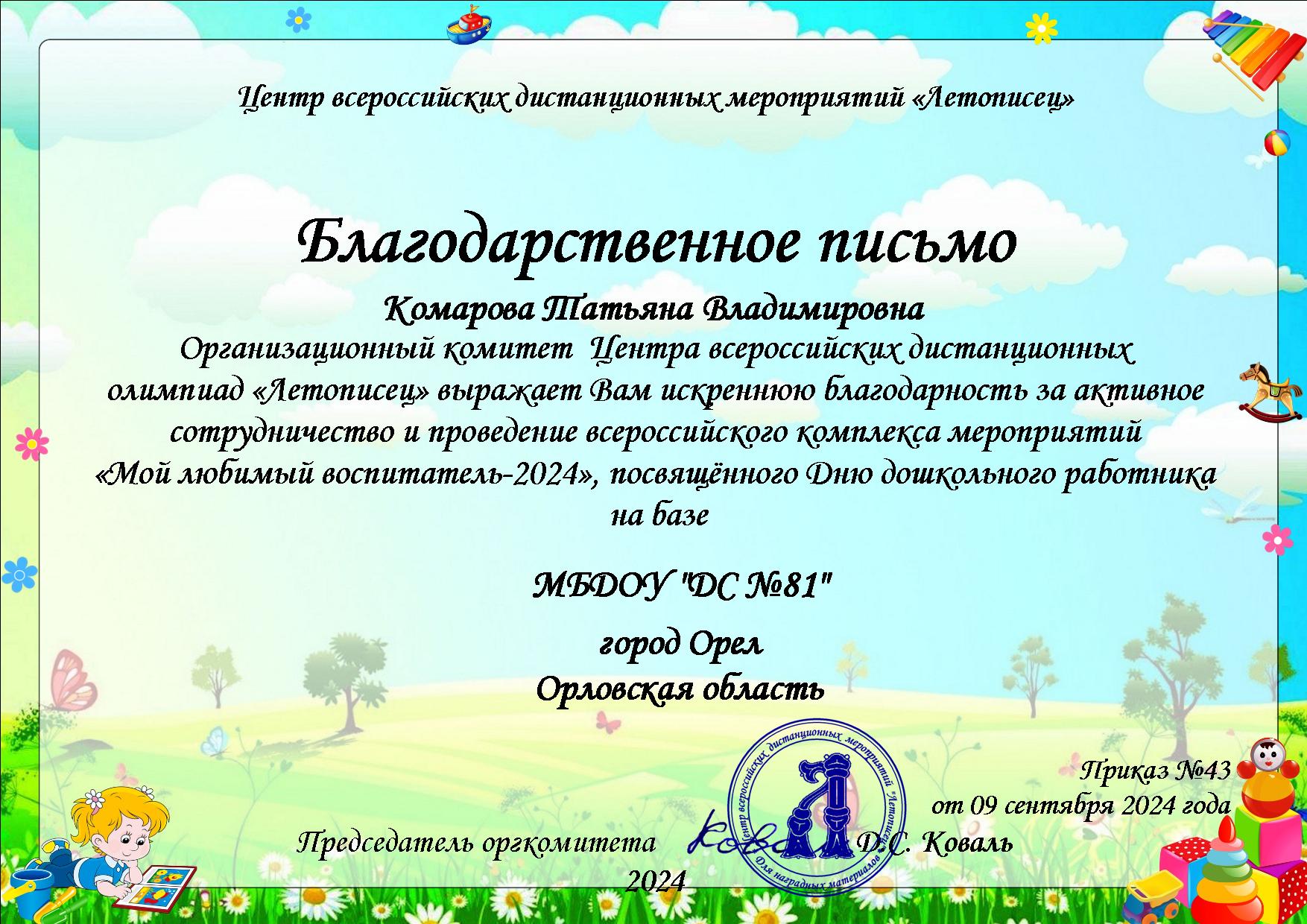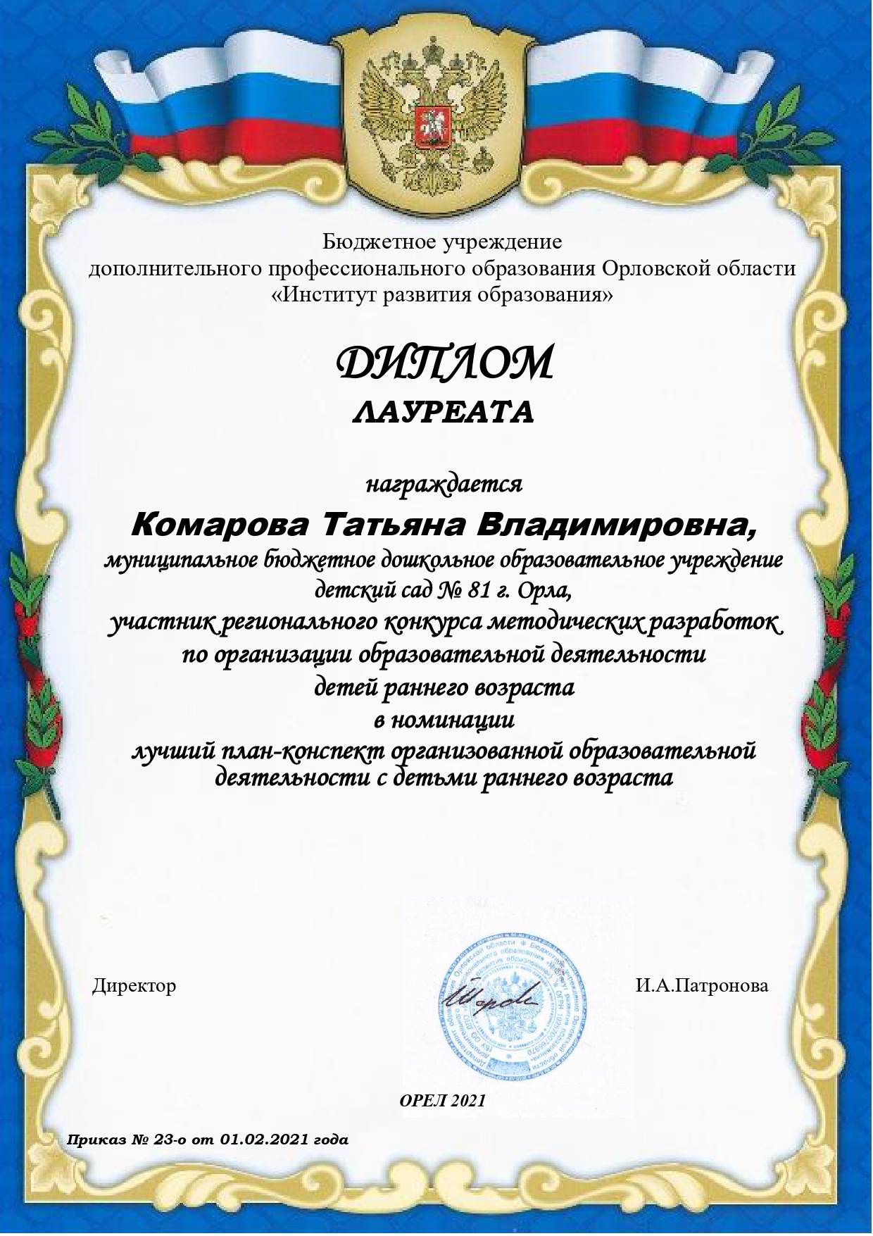 Высшая квалификационная категория по должности «воспитатель» приказ Департамент образования Орловской области от 14.01.2025 № 35 |