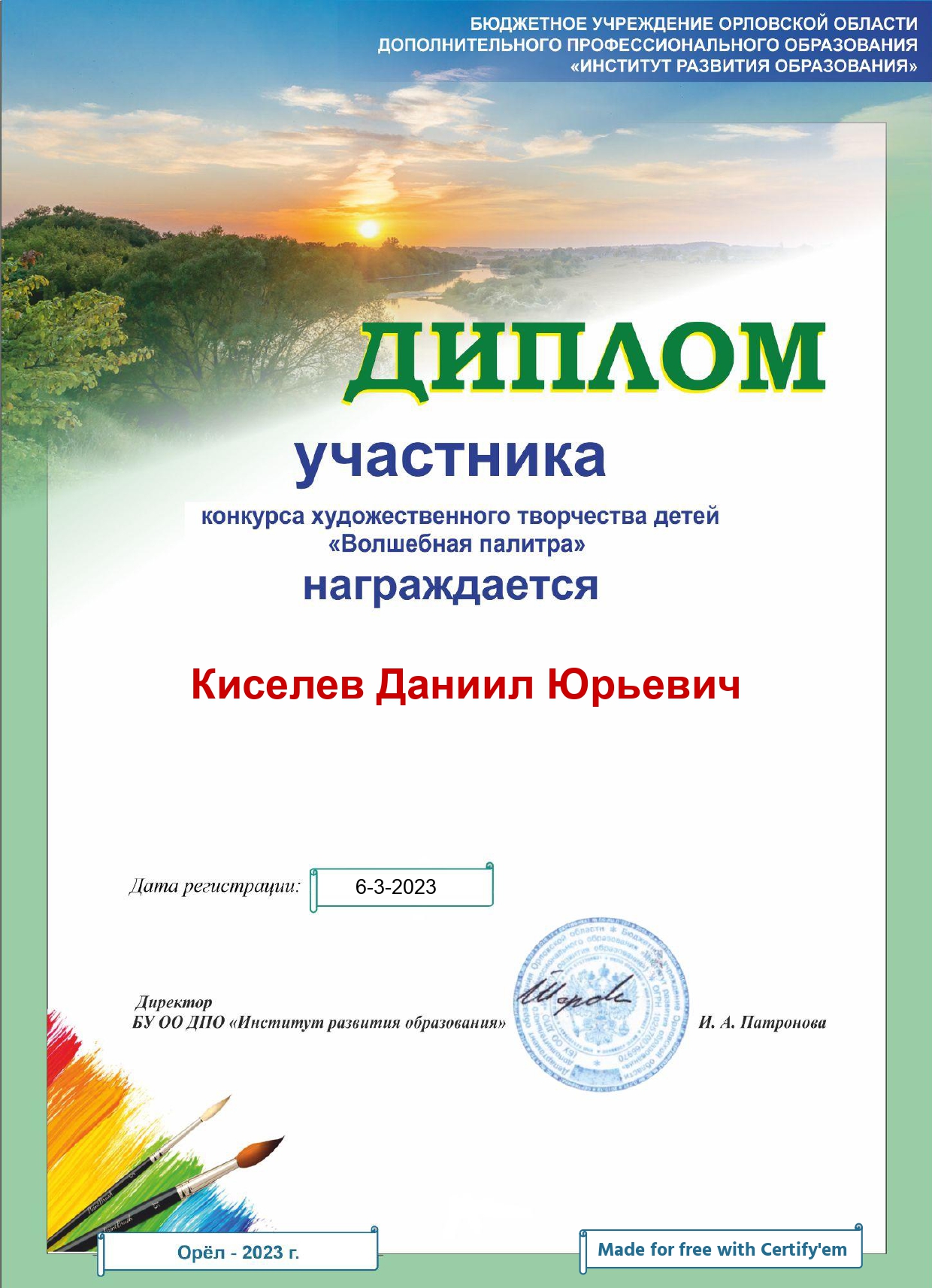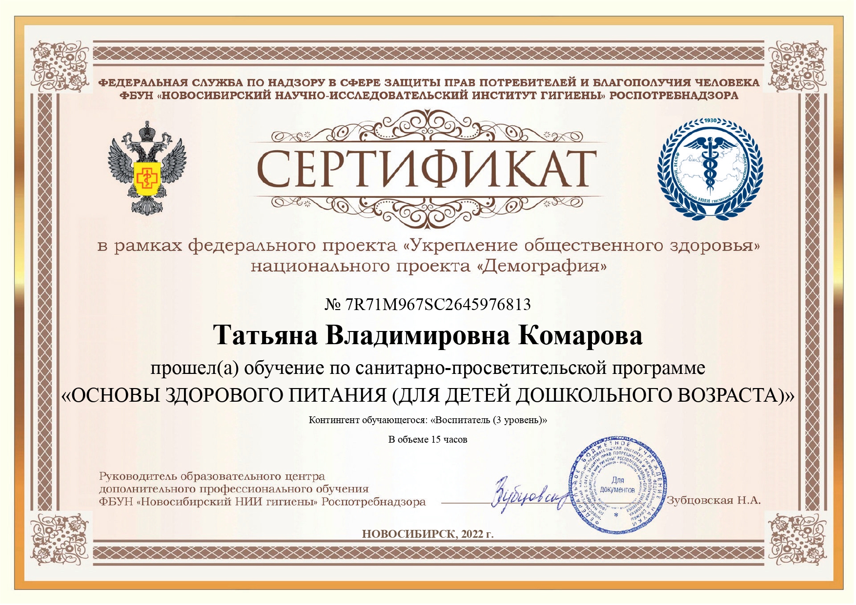 БУ ОО ДПО «Институт развития образования» Повышение квалификации по дополнительной профессиональной программе «Проектирование и реализация рабочей программы воспитания в дошкольной образовательной организации». Удостоверение о повышения квалификации ПК57 ИОМ №0494, 28.04.2023 |