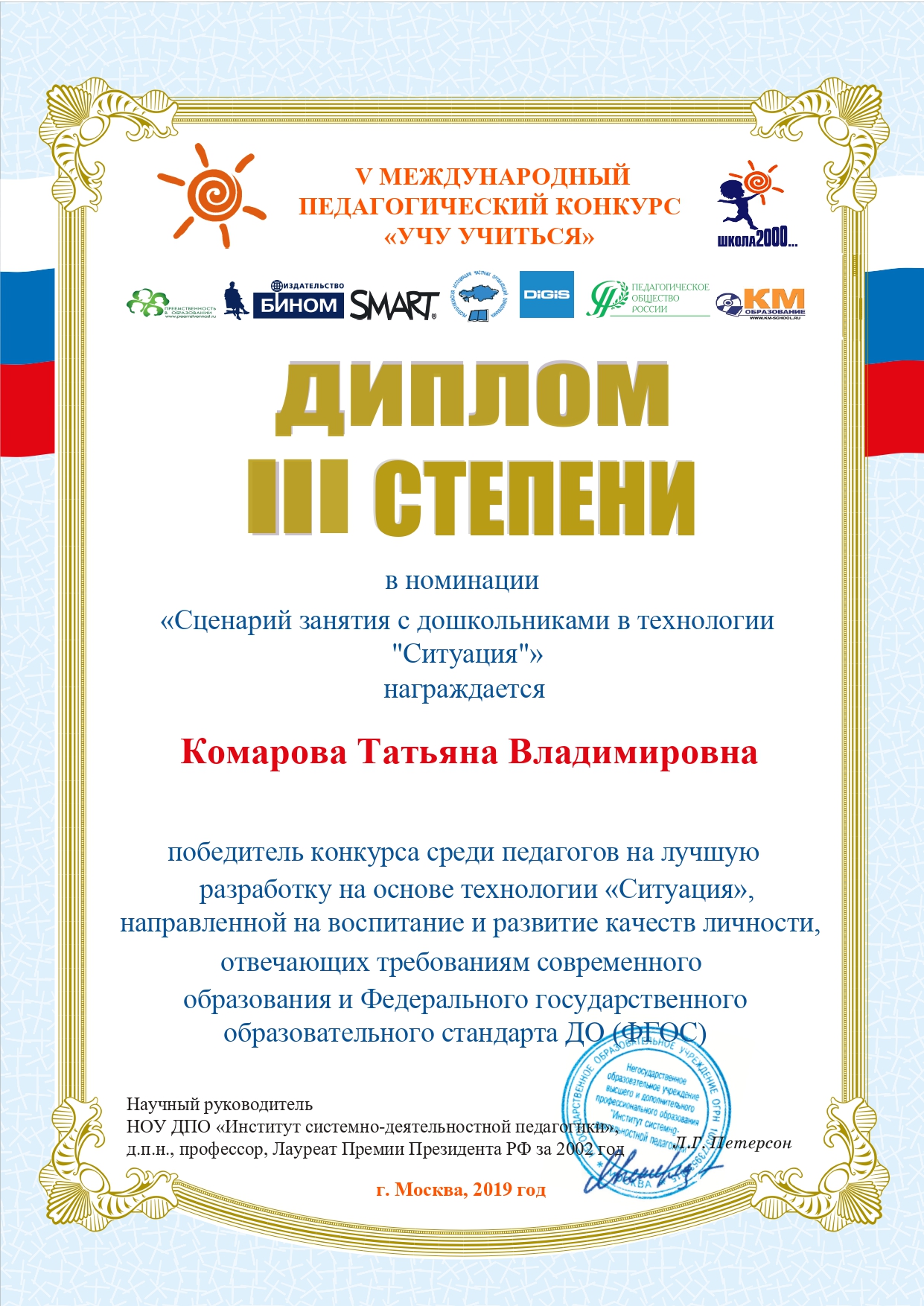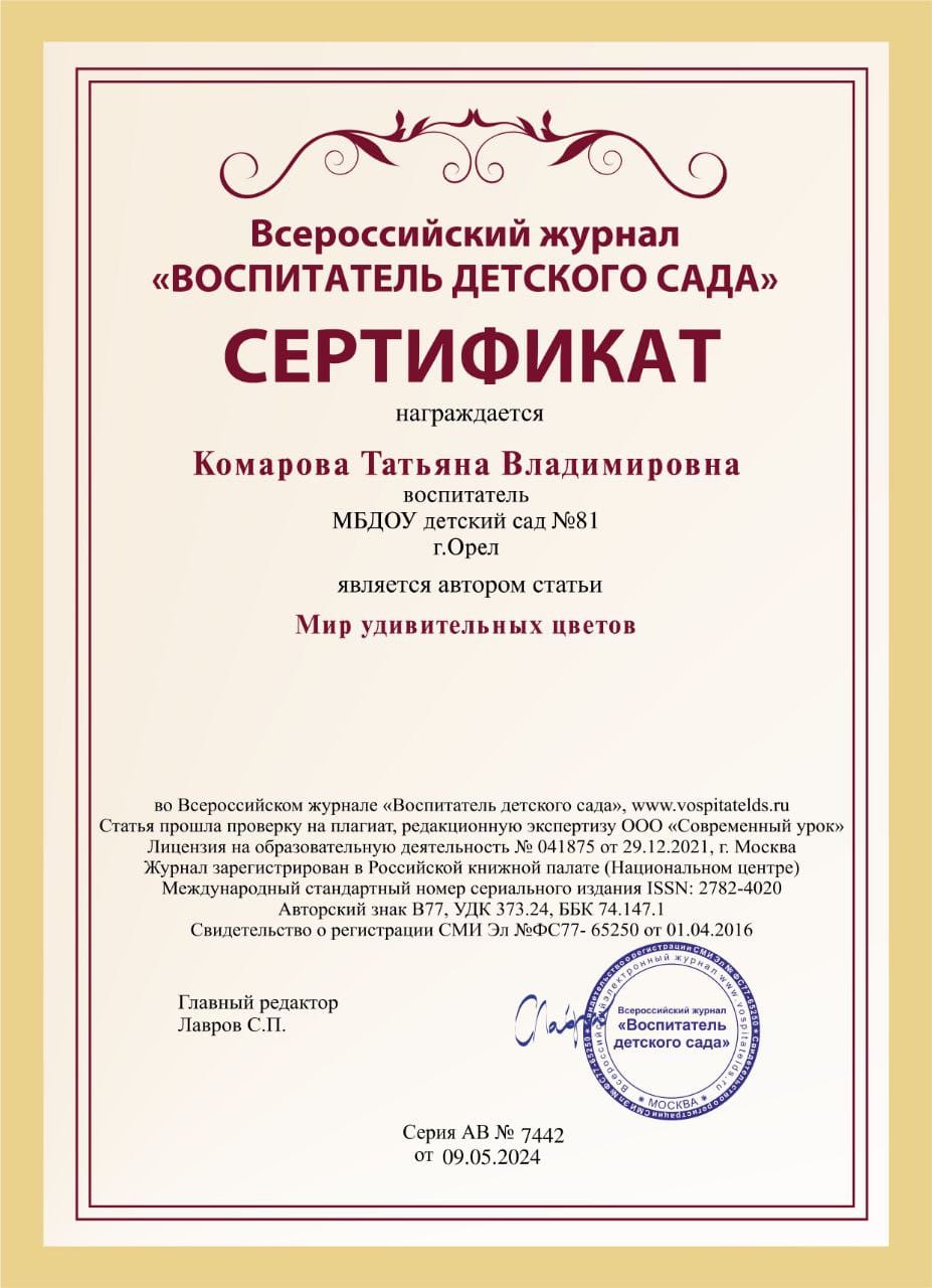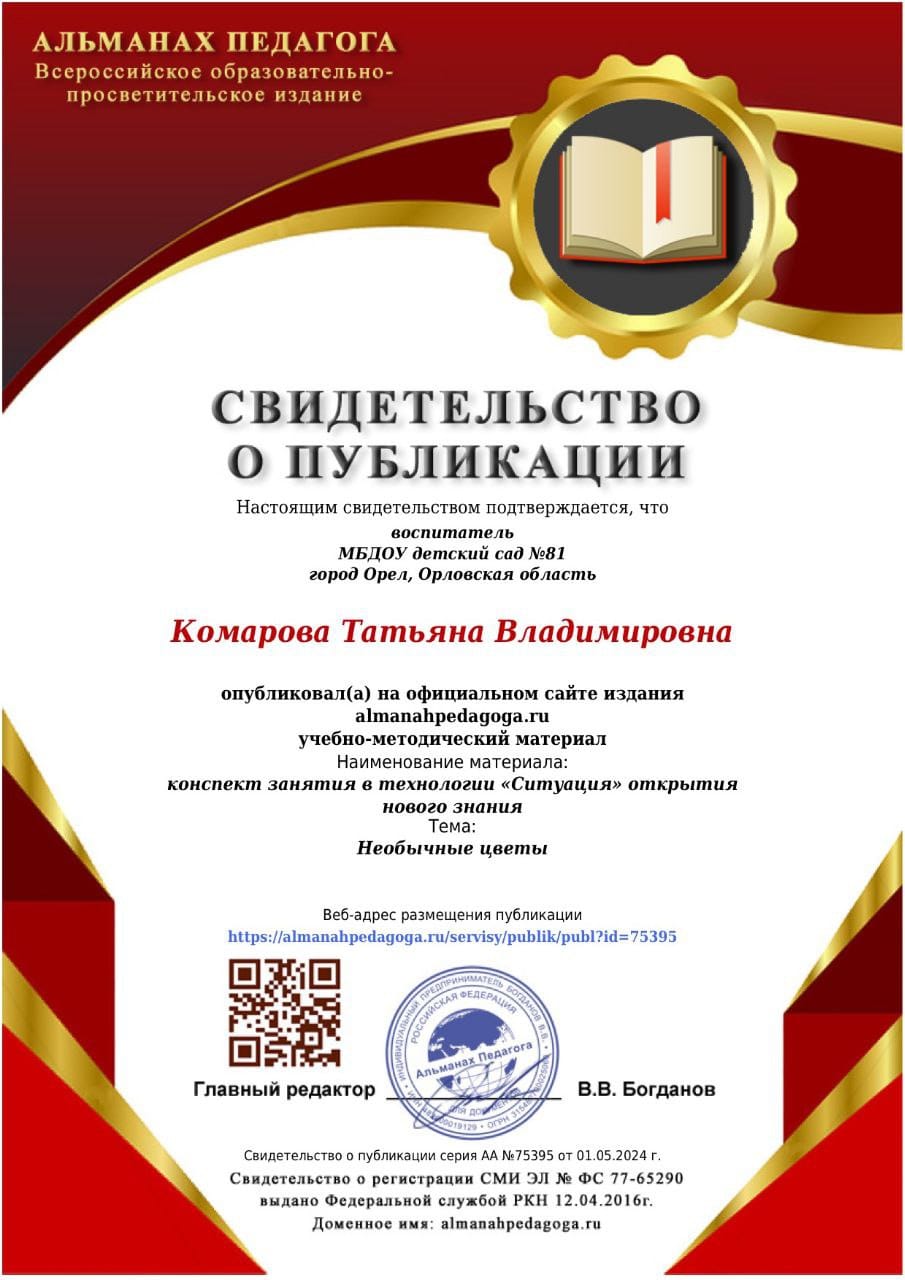 Статья «Всероссийский физкультурно-спортивный комплекс ГТО (1 ступени 6-8 лет) как важное средство физического развития дошкольников» Сборник «Педагогическая палитра: сборник методических материалов» Выпуск 7, часть 1, Орел, 2019; Конспект занятия в технологии «Ситуация» открытия нового знания» «Необычные цветы» Всероссийское образовательно-просветительское издание «Альманах Педагога» (серия АА №75395 от 01.05.2024), Статья «Мир удивительных цветов» Всероссийский журнал «Воспитатель детского сада» (серия АВ №74-42 от 09.05.2024), Конспект НОД «Волшебный цветок» Сетевое издание «ПедЖурнал» (свидетельство о публикации №1558515 от 01.05.2024). |